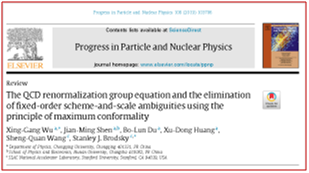 进一步压低前述第一种和第二种方案中存在的因未计算的高阶项所导致的残余能标不确定性;完成严格证明,PMC给出的理论预言值与重整化方案的选择无关;将PMC应用于分析欧洲大型强子对撞机新近获得的多项实验数据(如希格斯粒子衰变、顶夸克对产生、重夸克偶素产生等过程),很好地解释了相应的实验数据;提出基于PMC共形表达式来预言未知高阶的贡献的新方法;等等。在这些工作当中,课题组的多名硕士生和博士生起到了非常重要的作用。鉴于这些新的重要进展,《粒子物理和核物理进展》主编Faessler教授于2018年再度邀请课题组撰写综述。经过近一年时间的写作,特别是在