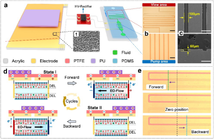 微流控系统是一个将生物/化学/医学/环境的反应、分离、检测等过程集成到一个具有设计微通道的小芯片中的实验平台,称为“芯片实验室”,已经广泛应用于各个研究领域的研究和开发。在微流控系统中微流泵是其核心元件,用于驱动和控制微流液体在芯片中工作,因此显示出重大的意义。在各种驱动装置中,电渗泵 (EOP) 与机械压力泵和热梯度驱动泵相比,由于其易于制造、流体速度恒定和高集成性等优点,被广泛应用于微流体系统。 电渗泵通常是通过改变引起电渗流 (EOF) 的双电层区域中电场的大小和方向来控制。 因此在这种情况下,必须使用外部高压 (HV) 直流电源来操纵电渗流。此外,高压电源体积大、成本高、不安全,会在电极附近形成气泡并产生焦耳热,从而影响微流效率。 这在很大程度上限制了基于电渗流的微流体系统的小型化和便携性。因此,现阶段非常需要经济、便携、安全、高效、可控的电渗泵产生高压的简便技术。