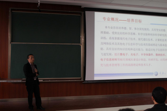 最后,由来自电子信息科学与技术的专业负责人汪涛教授介绍。汪教授提出“厚基础、宽口径、强能力、高素质”的指导原则,列出了五大课程体系,更骄傲地展现了电子信息科学技术专业的前景——可理论可实践、可深造可就业。广阔的发展前景使在场的不少同学为之心动。