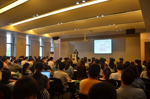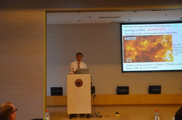 学术会员会主任王少峰教授主持。报告会上,唐叔贤院士首先介绍了离子晶体极性表面在催化活性和腐蚀反应中的重要作用,以及极性面对新能源领域的重要影响。在报告中,唐叔贤院士解释ZnO极性面的稳定存在机制,并给出极性表面重构机制的统一图像。此外还重点说明实验和理论方法相结合的研究手段在解决未知表面结构的重要性。一个半小时的报告中,唐叔贤院士将他在离子晶体表面性质的研究、探索、实践经验用时而亲切幽默、时而严谨务实的连珠妙语使讲座精彩纷呈,高潮迭起。报告厅内座无虚席。