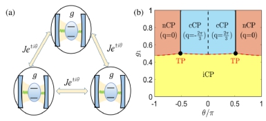 张瑜瑜副教授,胡自翔研究员,张学锋研究员,与中物院研究生院傅立斌教授,兰州大学罗洪刚教授,美国Rice University浦晗教授,提出了量子拉比三角模型作为合成规范场的最小单元,首次研究了人工磁场诱导的光子跃迁所产生的新量子相。该工作在原子频率极限下给出了系统的严格解析解,发现了弱耦合的非相干量子相(iCP),和强耦合下光子流的手性相干相(cCP)和正常相干相(nCP),前者破坏了Z2 和手性对称性,后者破坏了Z2 对称性。研究表明,人工规范场可调制光子流运动的方向性,诱导cCP到nCP的一级量子相变;而iCP到两种相干相的变化属于二级量子相变,准确计算其临界指数,与Dicke模型超辐射相变属于相同的普适类。 该工作不仅可模拟人工规范场下二维光与原子强耦合多体系统以及冷原子系统的许多物理现象,而且将来可以应用到量子计算模拟研究中。