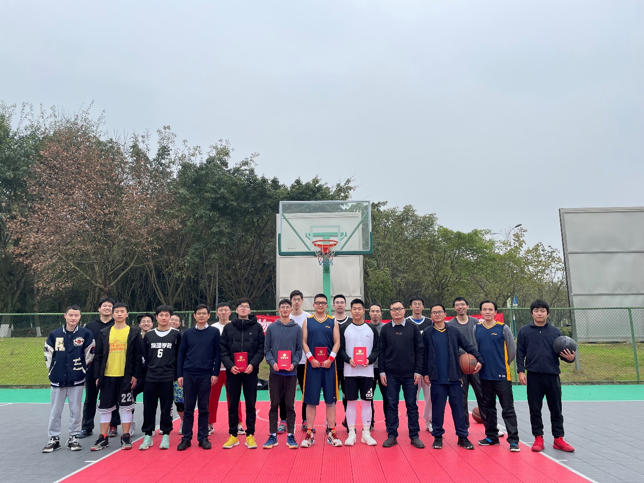 开幕赛由教工代表队、研究生代表队、本科生代表队三支球队依次对战的形式展开。首场表演赛,各支队伍都拿出最强实力,队员们早早地来到比赛场地,绕场慢跑,活动热身,为接下来的开幕赛做好了充分的准备。从日常师生关系到赛场上的对阵关系,大家都拿出专业精神,凝聚一心,展开了激烈的竞争。经过为期一周的比赛,教工代表队和研究生队最终挺进决赛。2021年12月23日下午,此次决赛在兰园篮球场进行,赛场上,双方球员你来我往,互不相让。比赛起始由研究生代表队成功拿下两球计五分领先,在先失两球的情况下,教师代表队紧追而上,分数成功反超对方。感到压力的研究生队咬紧牙关,奋起拼搏,凭借着身体上的灵活,学生代表队屡次突围,创造投球的机会。教师代表队也不甘示弱,凭借丰富的经验,数次将对方的进攻化于无形。双方一度僵持不下,展开了一场持久的拉锯战。最终全场比赛结束,研究生队以67:65的微弱优势赢得了比赛的胜利。