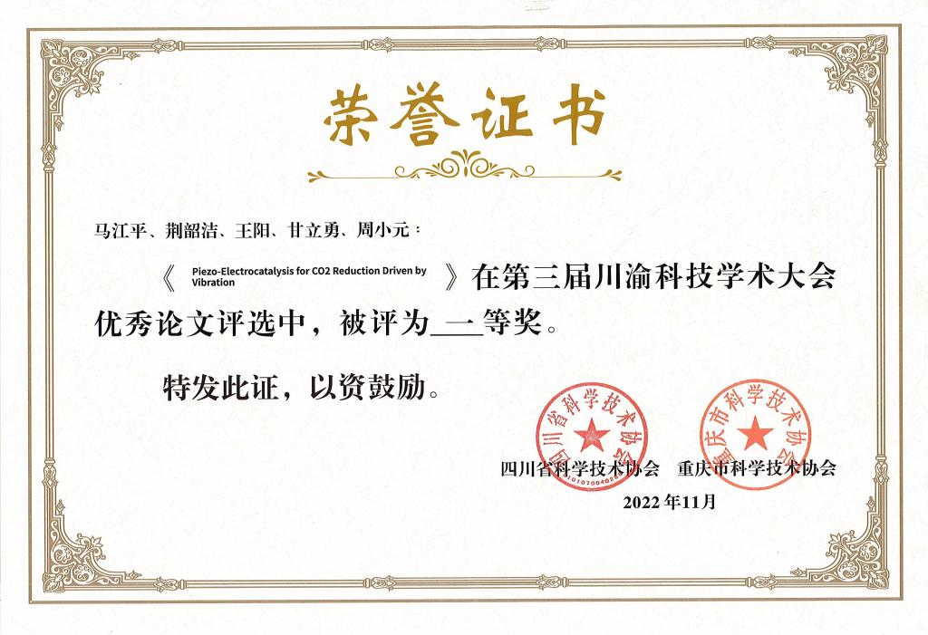 2022年11月23日,由四川省科学技术协会、重庆市科学技术协会联合举办的第三届川渝科学技术大会在成都举行,本届大会主题为“潜心学术研究 引领科技创新”。开幕式上,大会公布了年度川渝最具影响力学术活动、年度川渝一流学会、年度川渝一流科技期刊以及第三届川渝科技学术大会优秀论文获奖名单。我院周小元教授团队发表的论文《Piezo-electrocatalysis for CO2 Reduction Driven by Vibration》荣获第三届川渝科技学术大会优秀论文一等奖。