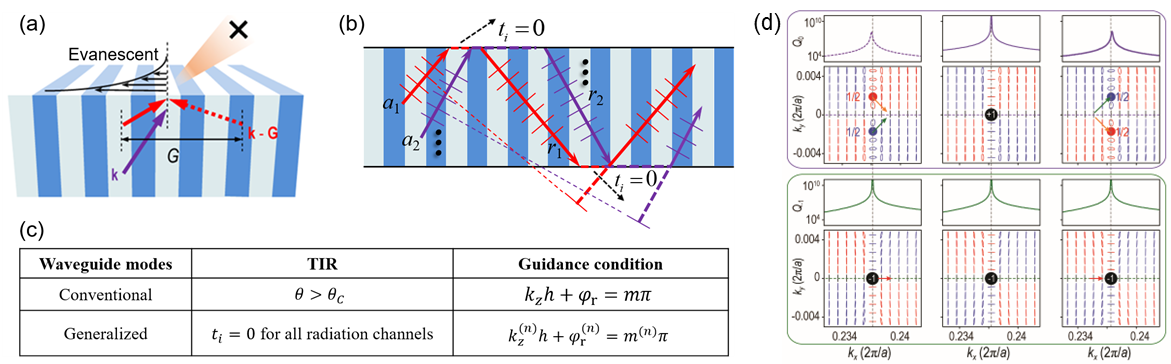 (a)光子晶体界面处两个布洛赫波的全内反射。(b)导波条件:当一个布洛赫波在平板内来回反射一次后,它不发生变化。(c)波导模式的传统和广义条件,其中广义波导模式则是BIC。(d) 多通道BIC的拓扑性质