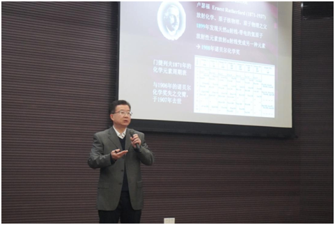 彭桓武书院的首任名誉院长,蔡荣根院士为到场的师生们介绍了彭桓武先生的治学精神和学术思想。蔡院士分享了彭桓武先生的生平,以及本人与彭桓武先生在科学研究和日常生活中交往的点点滴滴,深刻阐释了彭桓武先生的爱国情怀、学术思想、治学精神和高尚人格。他表示,彭桓武先生的治学精神、高尚理想以及淡漠名利的品质值得后人承载,彭桓武书院作为拔尖创新人才培养基地,一定要为国家培养出具备彭桓武先生那种爱国奉献、科学求真精神的创新拔尖人才。
