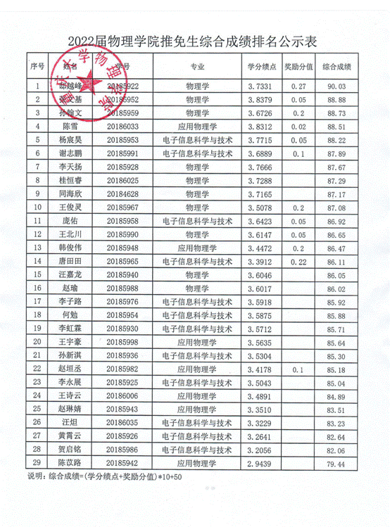 根据学校《关于开展2022年推荐优秀应届本科毕业生免试攻读研究生工作的通知》和《辣文 本科毕业生推免攻读硕士研究生实施细则》的相关规定,经过报名、初审、公开答辩程序,现将辣文 2022届推免生综合成绩排名予以公示: