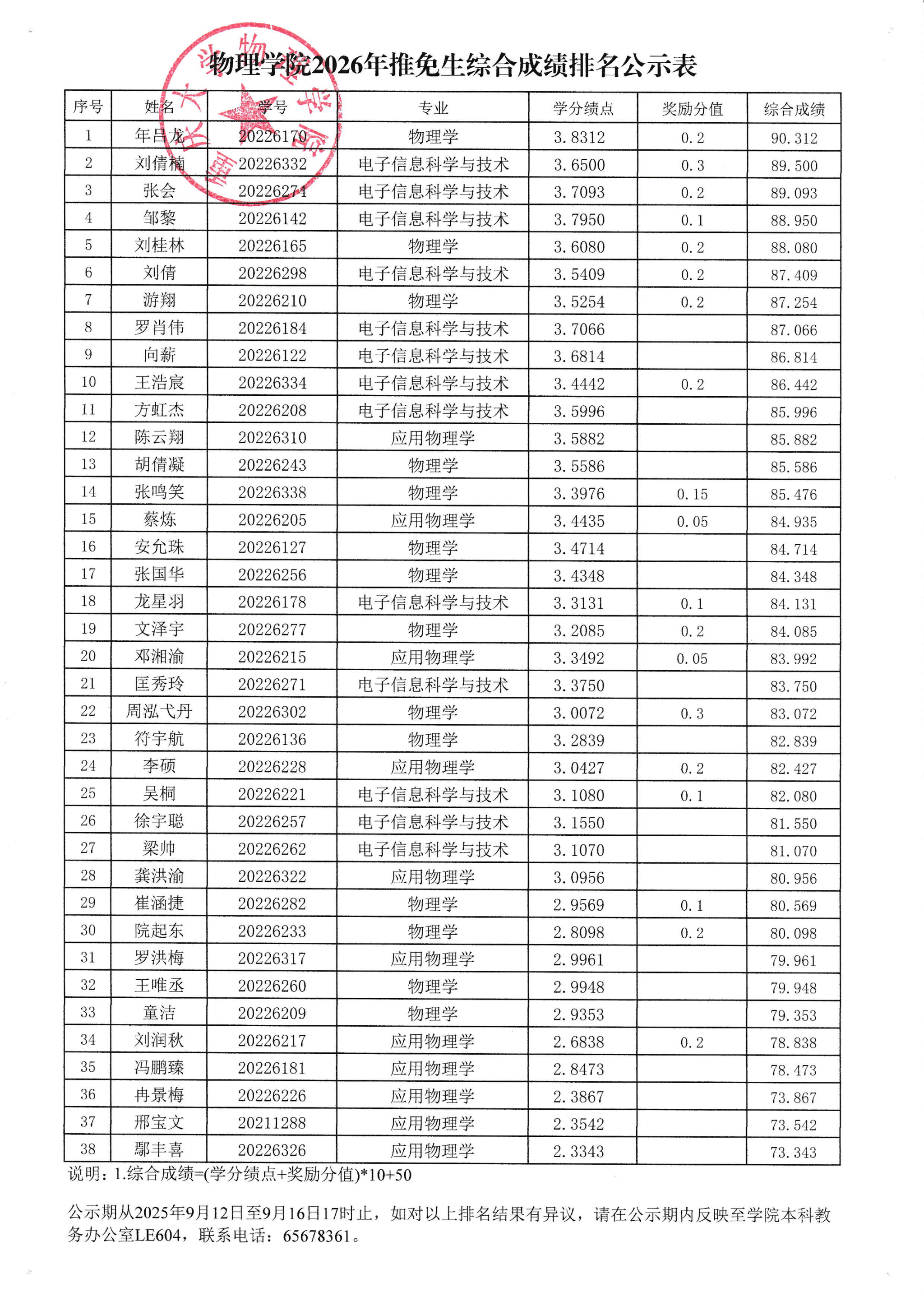 根据学校《关于开展2026年推荐优秀应届本科毕业生免试攻读研究生工作的通知》和《辣文 推荐优秀应届本科毕业生免试攻读研究生遴选工作细则》的相关规定,经过报名、初审、公开答辩程序,现将2026年推免生综合成绩排名予以公示: