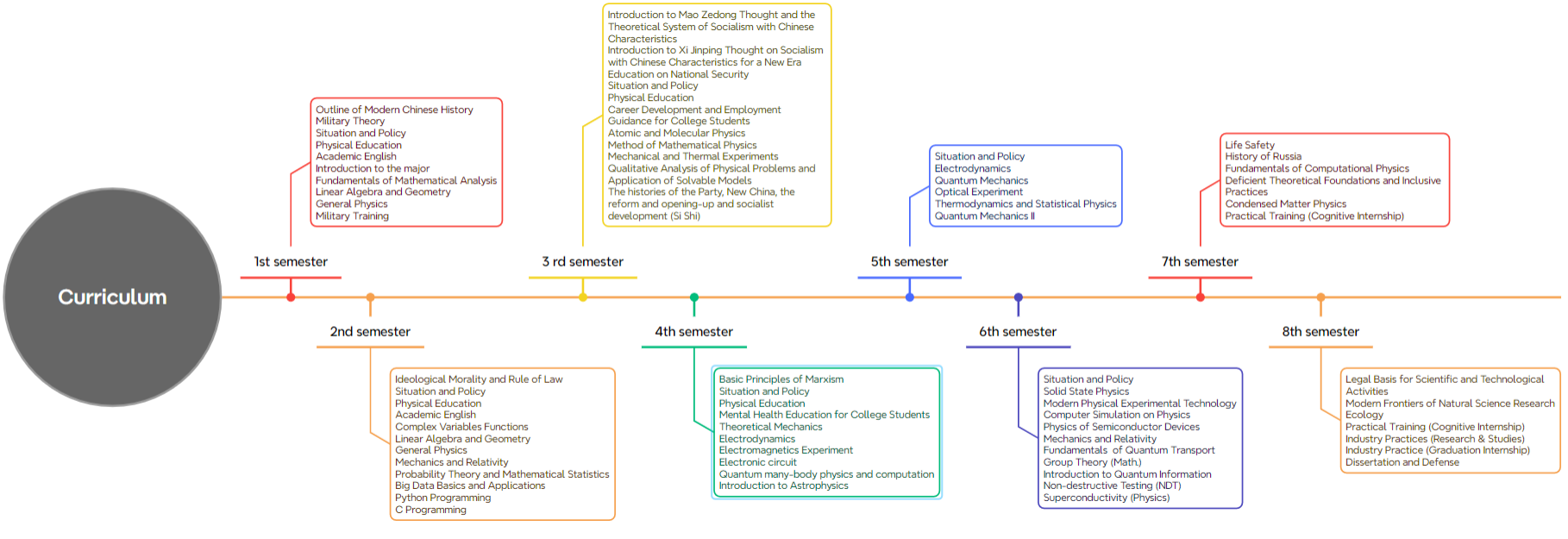 Introduction to the major, Complex Variables Functions, Fundamentals of Mathematical Analysis, Linear Algebra and Geometry, General Physics, Atomic and Molecular Physics, Method of Mathematical Physics, Mechanical and Thermal Experiments, Theoretical Mechanics, Electrodynamics, Electromagnetics Experiment, Quantum Mechanics, Optical Experiment, Fundamentals of Computational Physics, Thermodynamics and Statistical Physics, Solid State Physics, Modern Phycial Experimental Technology, Computer Simulation on Physics, Physics of Semiconductor Devices, Mechanics and Relativity, Condensed Matter Physics