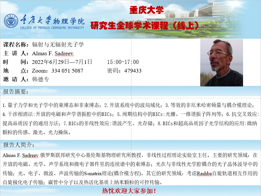 韩德专教授邀请俄罗斯联邦研究中心基伦斯基物理研究所Almas F. Sadreev教授 圆满完成了《辐射与无辐射光子学》的研究生线上课程。